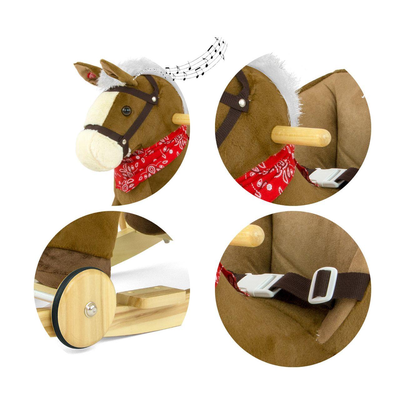 The rocker is made of soft and delicate to the touch plush material. It also has a neck wrap, halter, footrests on skids and interactive ears. When you press one of the ears will sound galloping horse and roaring, while touching the other, the child will hear the horse cheerful roaring horse.